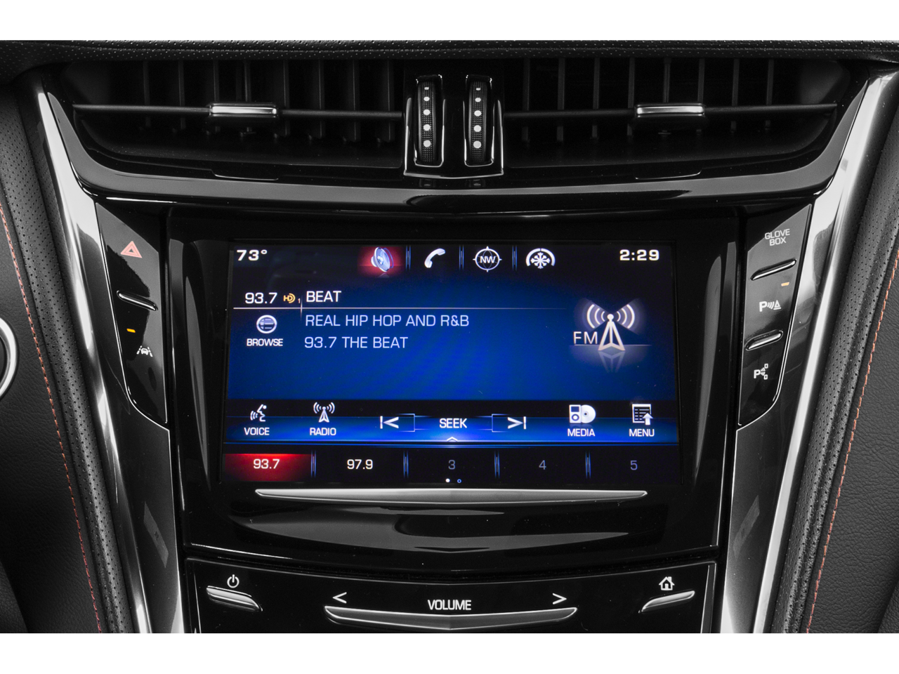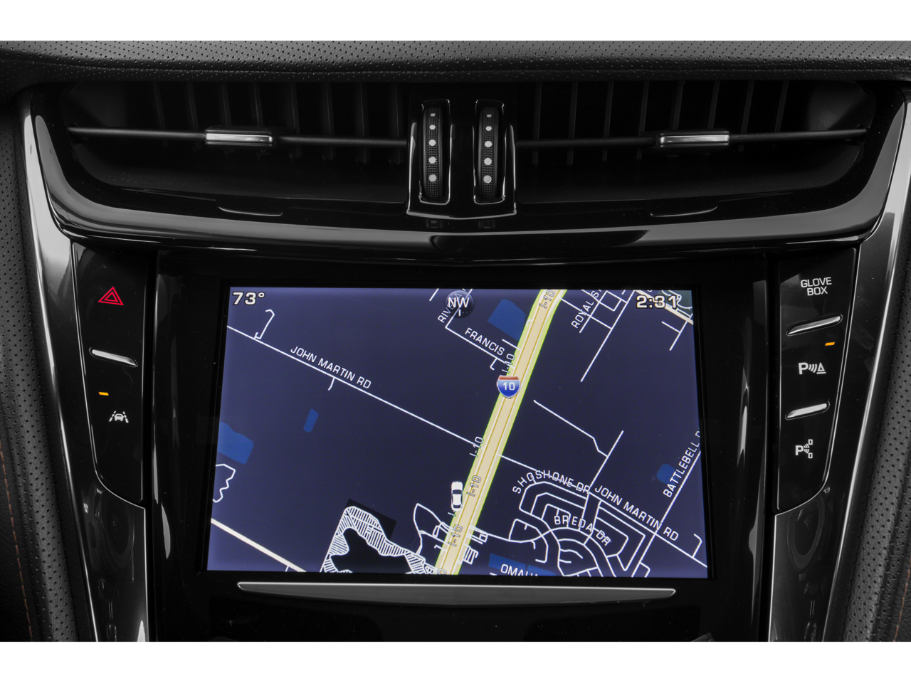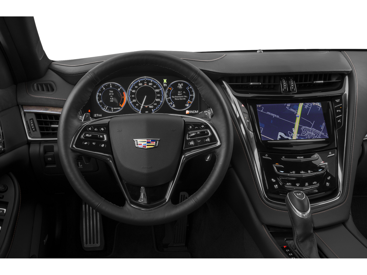 - Cadillac CUE Information and Media Control System with Embedded Navigation AM/FM stereo with embedded navigation, 8" color information display, three USB ports, SD card slot, auxiliary input jack and Natural Voice Recognition