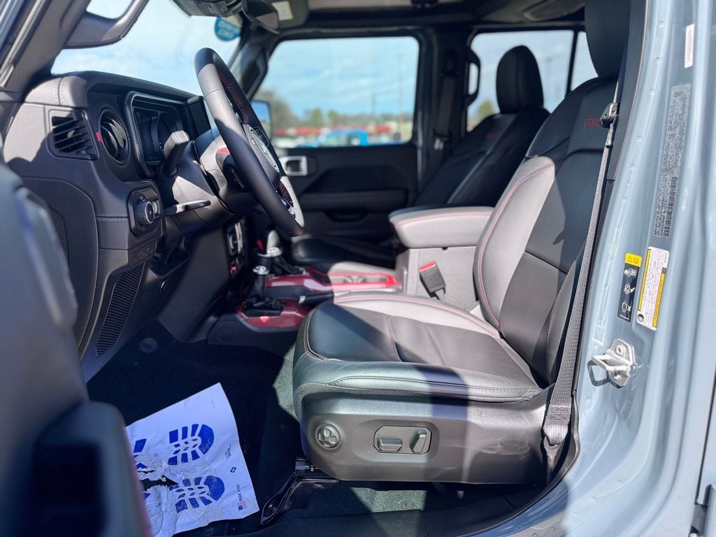 12.3 Touchscreen Display, 4-Wheel Disc Brakes, 4.10 Rear Axle Ratio, 8 Speakers, 97 MPH Vehicle Max Speed Calibration, ABS brakes, Air Conditioning, Alloy wheels, AM/FM radio: SiriusXM, Apple CarPlay, Apple CarPlay/Android Auto, Automatic temperature control, Aux Battery, Body Color 3-Piece Hard Top, Brake assist, Cloth Low-Back Bucket Seats, Compass, Connectivity - US/Canada, Convenience Group, Delay-off headlights, Disassociated Touchscreen Display, Driver door bin, Driver vanity mirror, Dual front impact airbags, Dual front side impact airbags, Electronic Stability Control, Emergency communication system: Jeep Connect, Front anti-roll bar, Front Bucket Seats, Front Center Armrest w/Storage, Front dual zone A/C, Front fog lights, Front License Plate Bracket, Front reading lights, Fully automatic headlights, Google Android Auto, Heated door mirrors, Heated Front Seats, Heated Steering Wheel, Illuminated entry, Integrated Center Stack Radio, Integrated roll-over protection, Integrated Voice Command w/Bluetooth®, Low tire pressure warning, MOPAR Hardtop Headliner, Non-Lock Fuel Cap w/o Discriminator, Occupant sensing airbag, Outside temperature display, Overhead airbag, Panic alarm, ParkView Rear Back-Up Camera, Passenger door bin, Passenger vanity mirror, Performance Suspension, Power door mirrors, Power steering, Power windows, Quick Order Package 24R Rubicon, Radio data system, Radio: Uconnect 5 w/12.3 Display, Rear anti-roll bar, Rear reading lights, Remote keyless entry, Remote Start System, Security system, Speed control, Split folding rear seat, Steering wheel mounted audio controls, Stop-Start Dual Battery System, Tachometer, Telescoping steering wheel, Tilt steering wheel, Traction control, Trip computer, Variably intermittent wipers, Voltmeter, Wheels: 17 x 7.5 Machined/Painted Black.